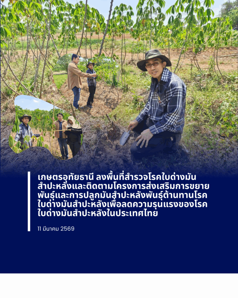 ข่าวประชาสัมพันธ์กิจกรรมเกษตรอุทัยธานี ลงพื้นที่สำรวจโรคใบด่างมันสำปะหลังและติดตามโครงการส่งเสริมการขยายพันธุ์และการปลูกมันสำปะหลังพันธุ์ต้านทานโรคใบด่างมันสำปะหลังเพื่อลดความรุนแรงของโรคใบด่างมันสำปะหลังในประเทศไทย admin_doae / 12 มีนาคม 2026 เมื่อวันที่ 11 มีนาค