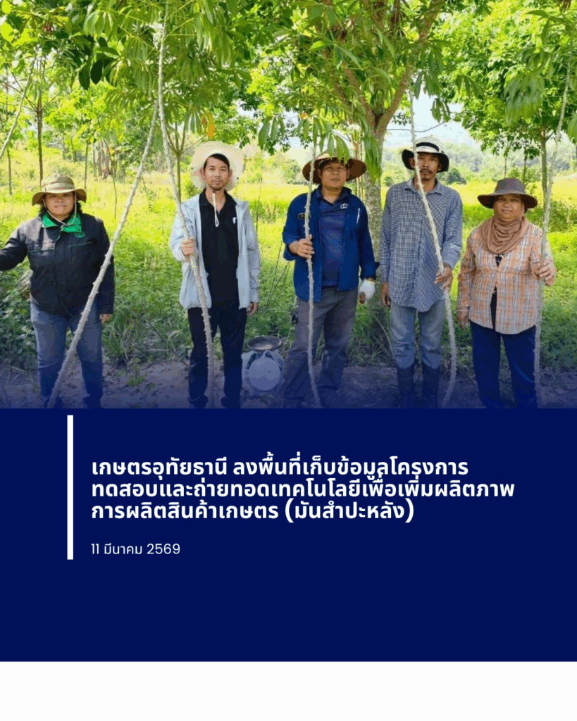ข่าวประชาสัมพันธ์กิจกรรมเกษตรอุทัยธานี ลงพื้นที่เก็บข้อมูลโครงการทดสอบและถ่ายทอดเทคโนโลยีเพื่อเพิ่มผลิตภาพการผลิตสินค้าเกษตร (มันสำปะหลัง) admin_doae / 9 มีนาคม 2026 เมื่อวันที่ 9 มีนาคม
