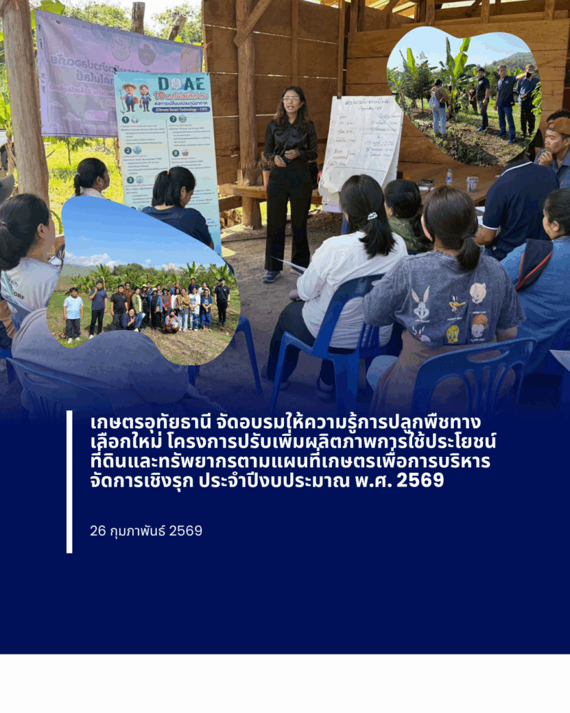 ข่าวประชาสัมพันธ์กิจกรรมเกษตรอุทัยธานี จัดอบรมให้ความรู้การปลูกพืชทางเลือกใหม่ โครงการปรับเพิ่มผลิตภาพการใช้ประโยชน์ที่ดินและทรัพยากรตามแผนที่เกษตรเพื่อการบริหารจัดการเชิงรุก ประจำปีงบประมาณ พ.ศ. 2569 admin_doae / 27 กุมภาพันธ์ 2026 เมื่อวันที่ 26 กุมภา