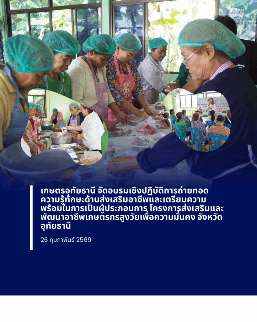 ข่าวประชาสัมพันธ์กิจกรรมเกษตรอุทัยธานี จัดอบรมเชิงปฏิบัติการถ่ายทอดความรู้ทักษะด้านส่งเสริมอาชีพและเตรียมความพร้อมในการเป็นผู้ประกอบการ โครงการส่งเสริมและพัฒนาอาชีพเกษตรกรสูงวัยเพื่อความมั่นคง จังหวัดอุทัยธานี admin_doae / 27 กุมภาพันธ์ 2026 เมื่อวันที่ 26 กุมภา