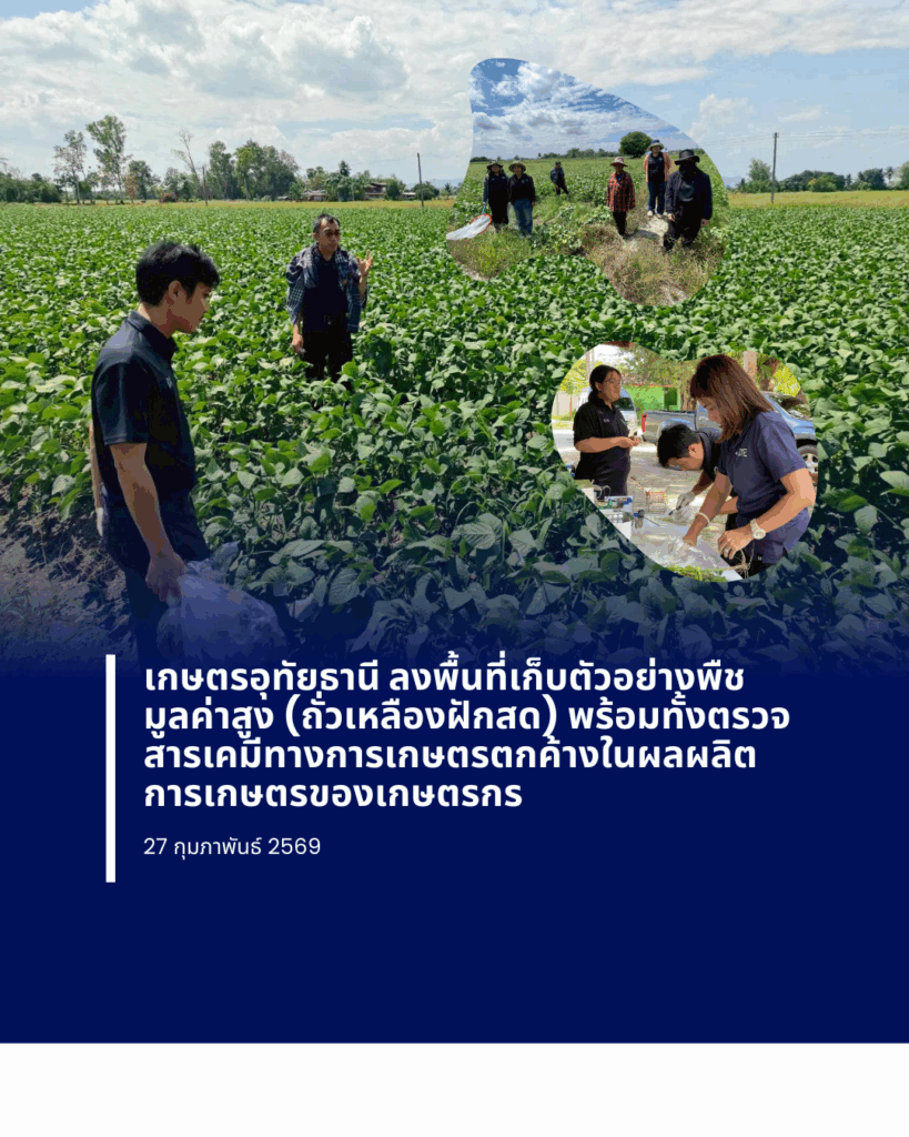 ข่าวประชาสัมพันธ์กิจกรรมเกษตรอุทัยธานี ลงพื้นที่เก็บตัวอย่างพืชมูลค่าสูง (ถั่วเหลืองฝักสด) พร้อมทั้งตรวจสารเคมีทางการเกษตรตกค้างในผลผลิตการเกษตรของเกษตรกร admin_doae / 2 มีนาคม 2026 เมื่อวันที่ 27 กุมภา
