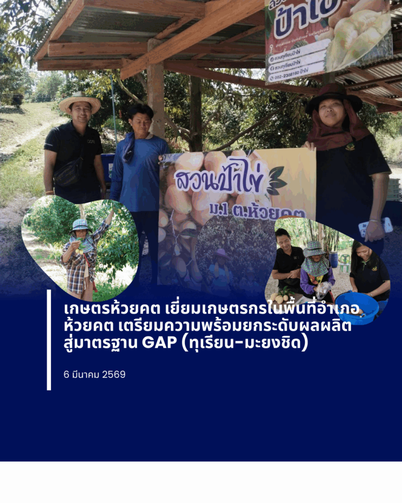 ข่าวประชาสัมพันธ์กิจกรรมเกษตรห้วยคต เยี่ยมเกษตรกรในพื้นที่อำเภอห้วยคต เตรียมความพร้อมยกระดับผลผลิตสู่มาตรฐาน GAP (ทุเรียน-มะยงชิด) admin_doae / 6 มีนาคม 2026 เมื่อวันที่ 6 มีนาคม