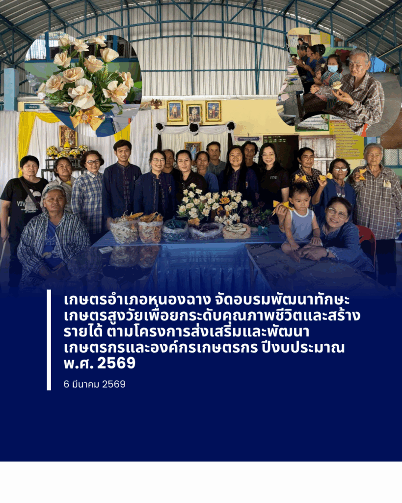 ข่าวประชาสัมพันธ์กิจกรรมเกษตรอำเภอหนองฉาง จัดอบรมพัฒนาทักษะเกษตรสูงวัยเพื่อยกระดับคุณภาพชีวิตและสร้างรายได้ ตามโครงการส่งเสริมและพัฒนาเกษตรกรและองค์กรเกษตรกร ปีงบประมาณ พ.ศ. 2569 admin_doae / 6 มีนาคม 2026 เมื่อวันที่ 5 มีนาคม